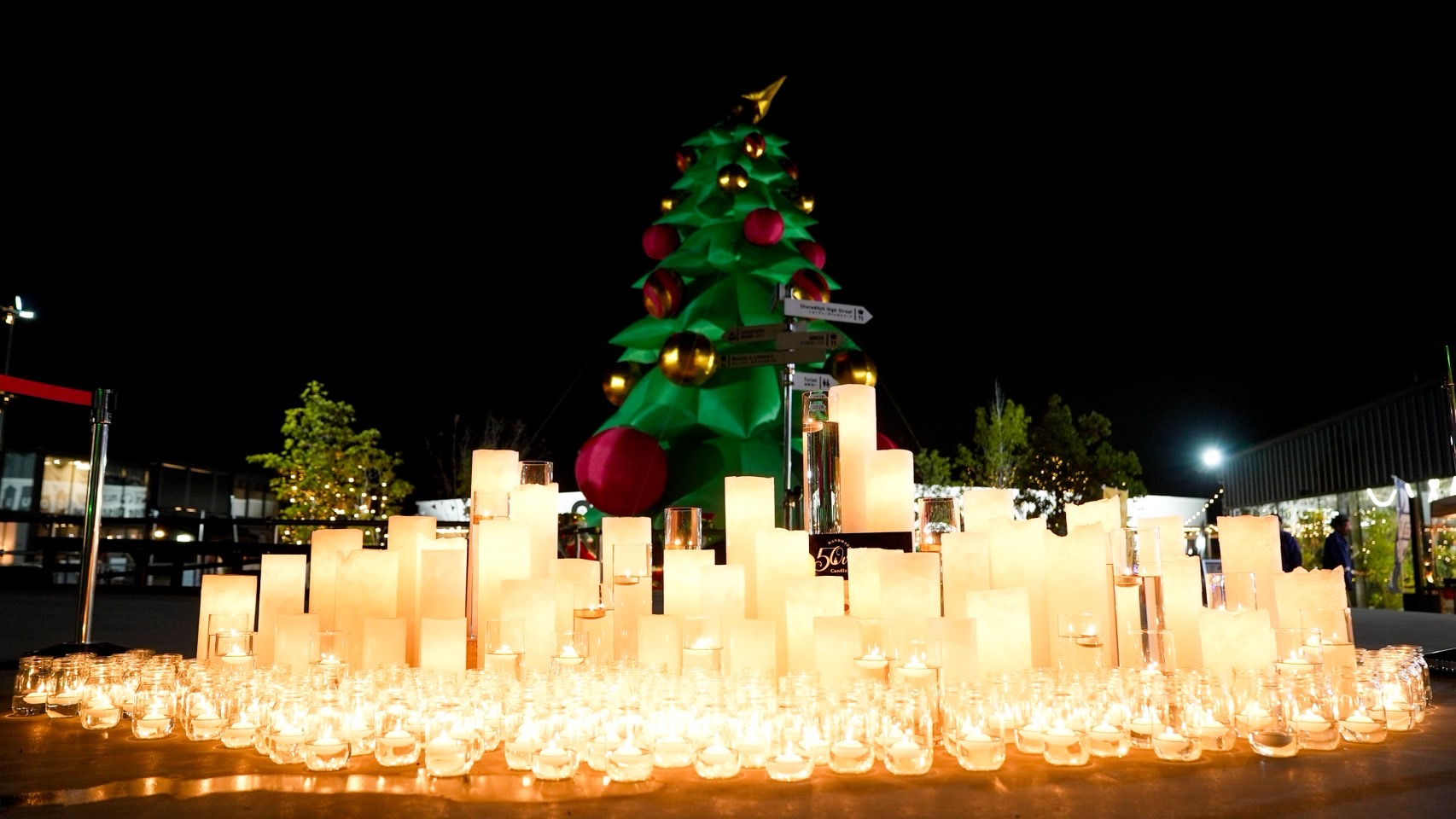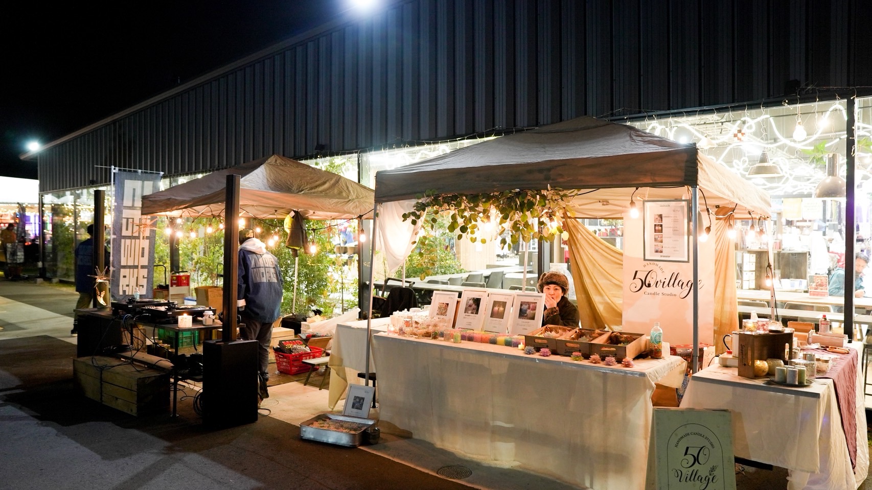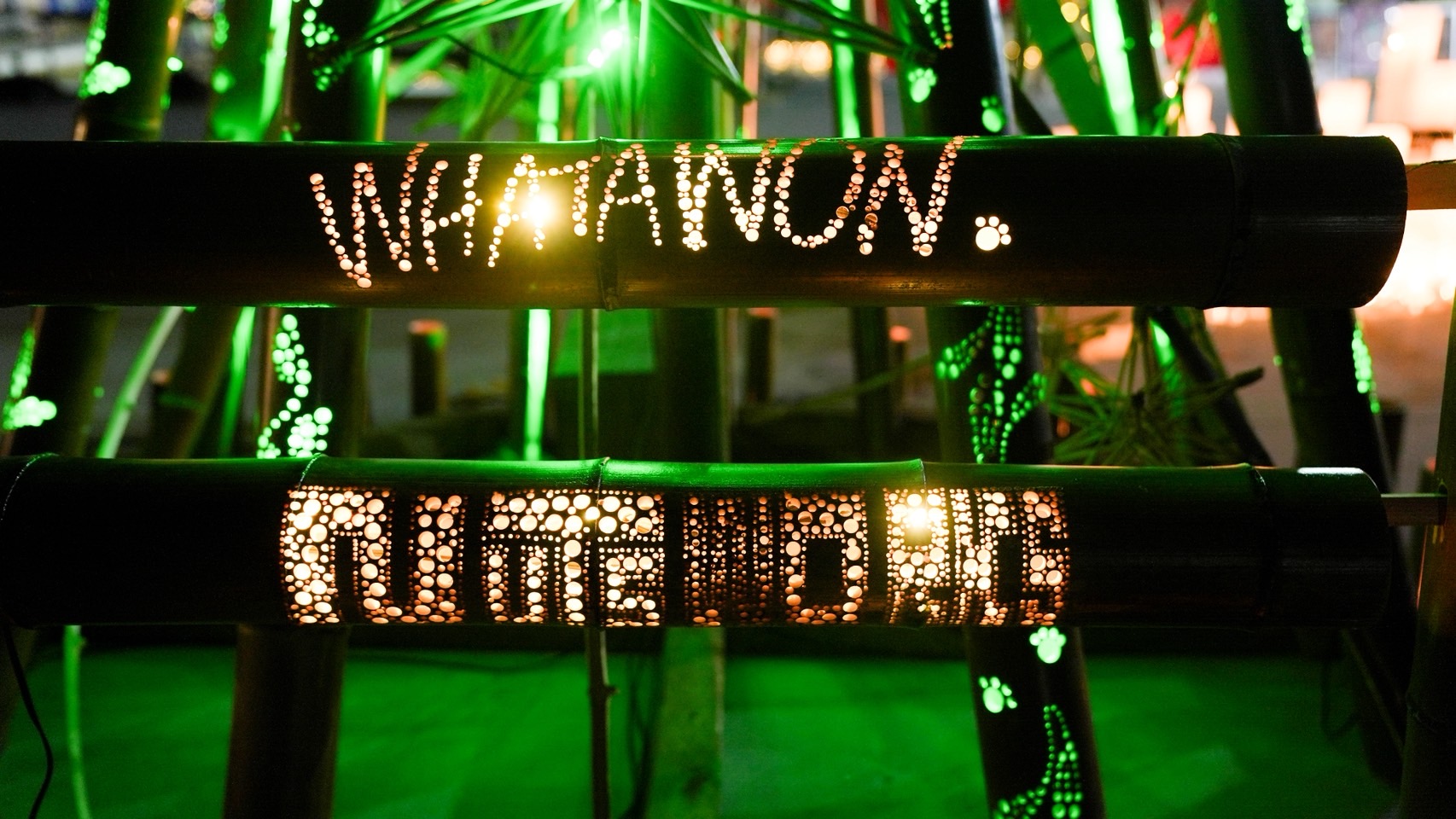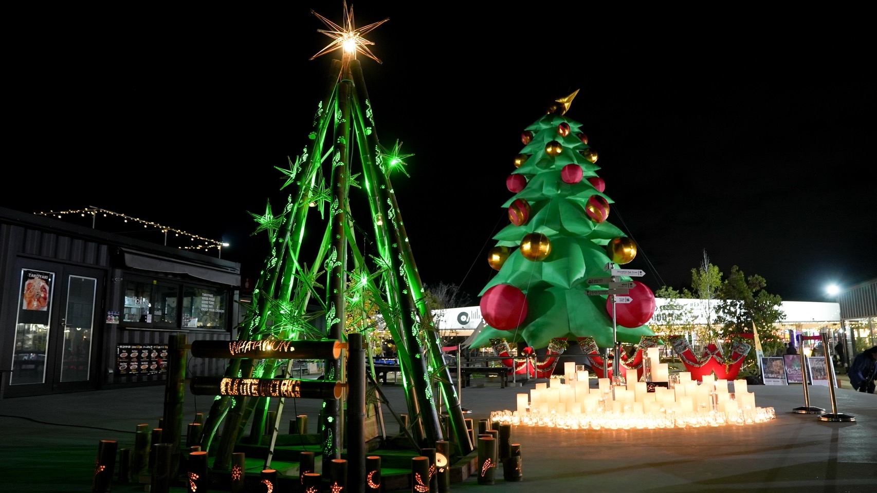 オシャレなWHATAWONさんに緑のLEDで電飾した竹あかりツリーが映えますよ。